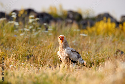 Egyptian vulture, Neophron percnopterus, big bird of prey sitting on the stone in nature habitat, Spain, Europe. White vulture with yellow bill. Wildlife in Spain.