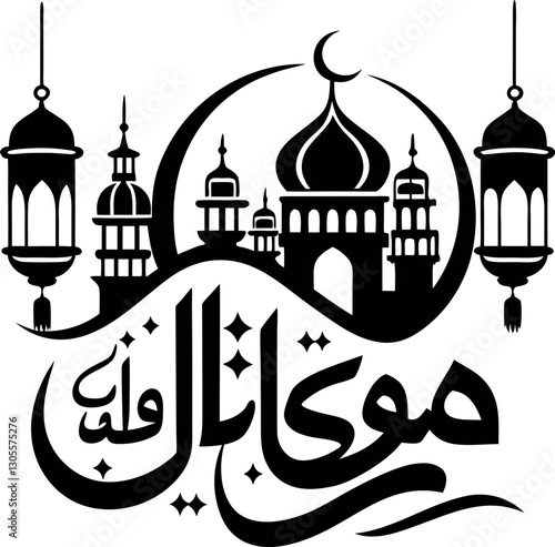 Eid Mubarak Calligraphy with Mosque and Lantern Silhouette – Islamic Festival Vector Art