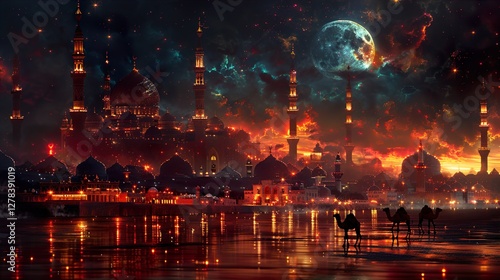 Eid mubarak, eid al adha mubarak with a camel and with a cloudy background with mosque , moon, lamps, stars muslim festival 2024. Eid celebration, HD 8K wallpaper Photographic Image