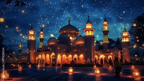 Eid mubarak ramadan kareem: islamic mosque night lights silhouette