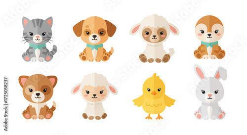 Eight adorable cartoon baby animals sitting, including a cat, dog, lamb, deer, chick, and rabbit.