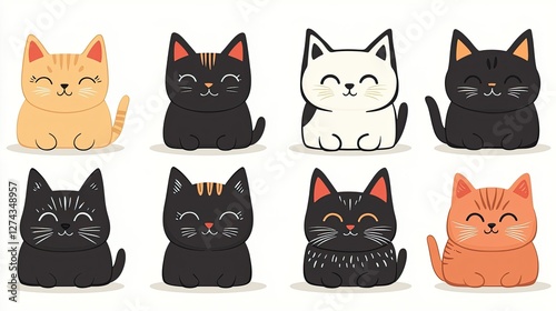 Eight Adorable Cartoon Cats Sitting Happily