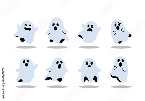 Eight adorable light blue ghosts floating with various expressions for halloween decoration design