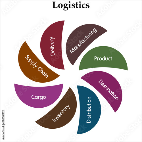 Eight aspects of Logistics - Manufacturing. Product, Destination, Distribution. Inventory, Cargo, Supply chain, Delivery. Infographic template with icons