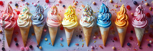 Eight colorful soft-serve ice cream cones in waffle cones arranged in a row. Concept of dessert variety and indulgence. For food photography.