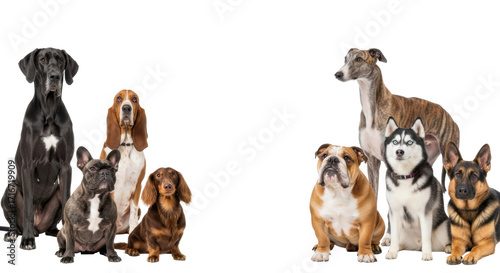 Eight diverse dog breeds, including a Great Dane, Husky, and German Shepherd, gaze upward on a transparent studio background with central copy space, showcasing canine diversity and attentiveness