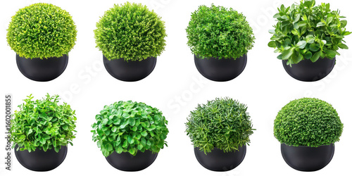 Eight Green Potted Plants: Decorative Topiary Arrangements