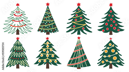 Eight Hand Drawn Christmas Trees Red Green Gold Ornaments