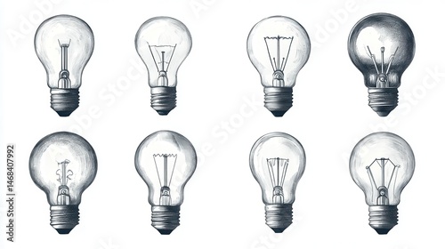 Eight hand-drawn incandescent light bulbs, showcasing vintage design and intricate details.