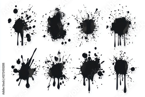 Eight high-res black ink splatters. Perfect for design, texture, and artistic projects.