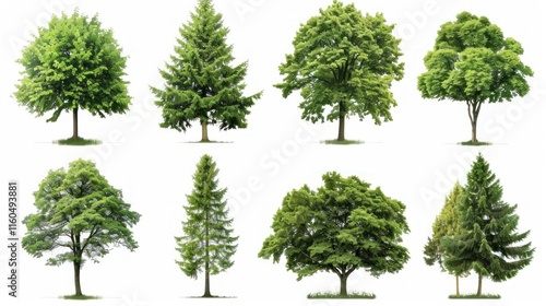 Eight lush green trees isolated on white background.