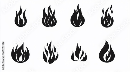 Eight minimalist black flame icons with varying shapes on a white background