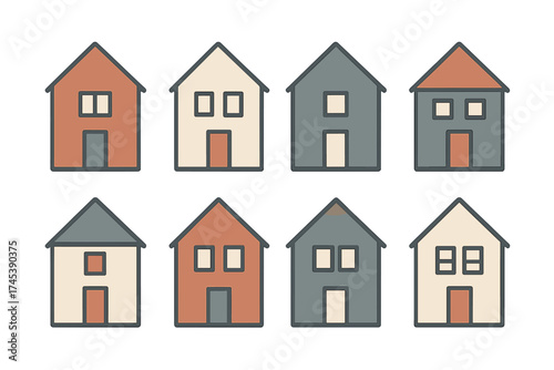 Eight stylized residential houses icons in muted colors for real estate and neighborhood graphics