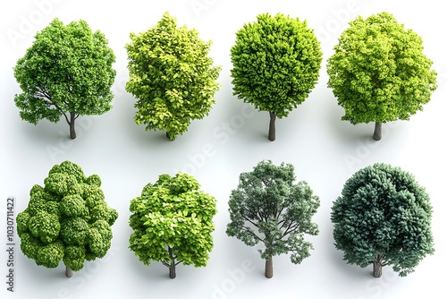 Eight vibrant green trees on a white background
