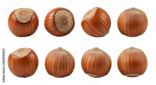 Eight whole hazelnuts shown from different angles on background food ingredient image
