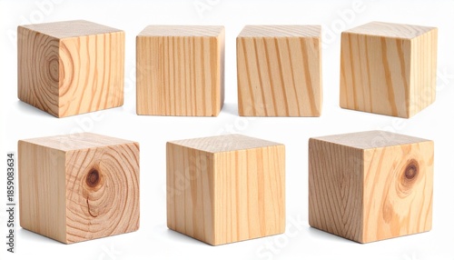Eight wooden cubes in two rows on white background, showcasing diverse grain patterns and natural texture.