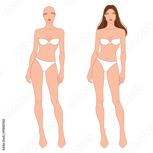 Eight-head fashion figure template. The female fashion croquis. Vector illustration of a young woman wearing lingerie, isolated on a white background.