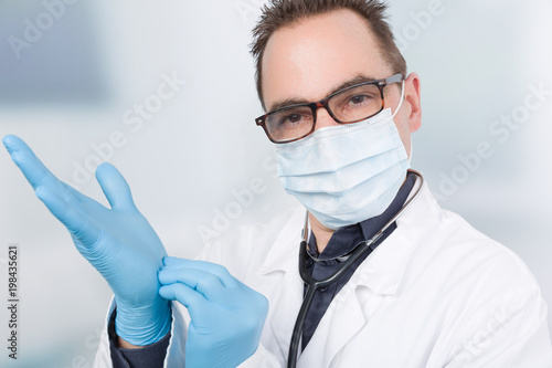 Ein Arzt mit Mundschutz zieht sich Latexhandschuhe an