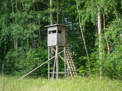 Ein jagdlicher Ansitz steht am Waldrand an einer Wiese.