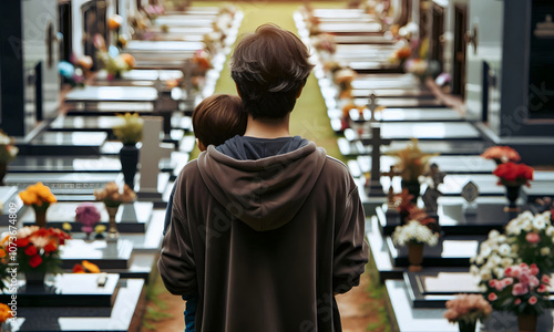 Ein junger Mann mit einem Kind steht traurig auf einem Friedhof, Hintergrund unscharf, close up, copy space