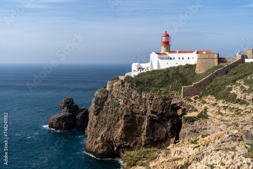 Ein Leuchtturm an der Küste thront auf den Felsen über dem Meer in Portugal an der Algarve bei Sagres