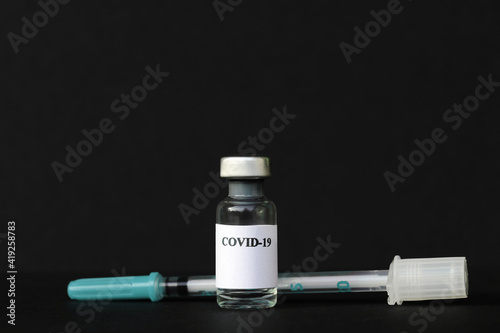 Eine Corona-Impfflasche und eine Spritze vor einem schwaren Hintergrund