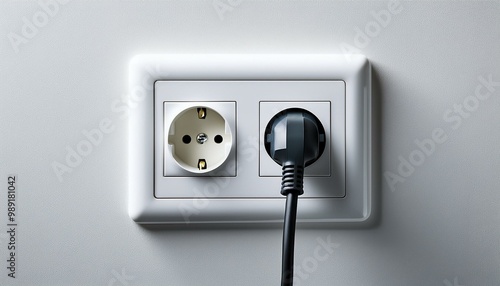 Eine Doppelsteckdose mit Stecker mitten in einer weißen Wand.