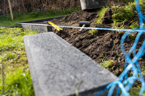 Eine Fläche im Garten vermessen um Bordsteine zu setzen