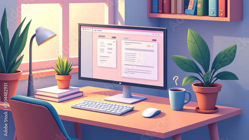 Eine isometrische Darstellung eines modernen Remote-Arbeitsplatz-Setups – ein Home-Office-Schreibtisch mit Monitoren. KI Generated
