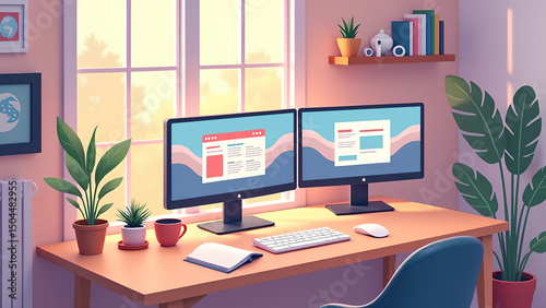 Eine isometrische Darstellung eines modernen Remote-Arbeitsplatz-Setups – ein Home-Office-Schreibtisch mit Monitoren. KI Generated