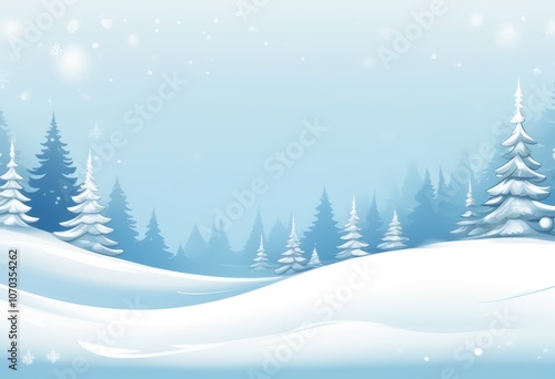 Eine ruhige Winterlandschaft mit verschneiten Tannen und sanftem Schneefall unter einem klaren blauen Himmel, ideal für Textfreiraum. Generative KI.