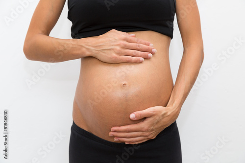 eine schwangere Frau hat ihre Hände auf dem Bauch