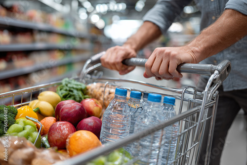 Einkaufswagen mit frischem Obst, Gemüse und Wasserflaschen im Supermarktgang