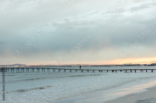 Einsamer Spaziergänger läuft bei Dämmerung über einen Steg am Meer