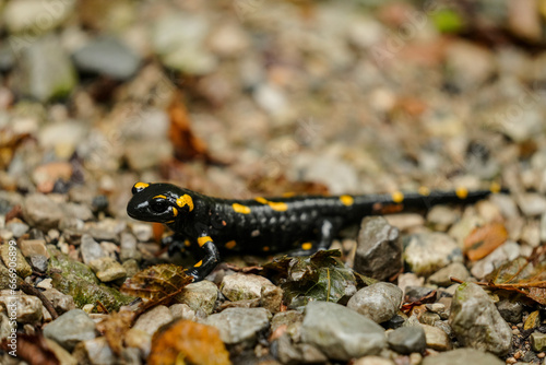 einzelner Feuersalamander auf einem steinigen Untergrund