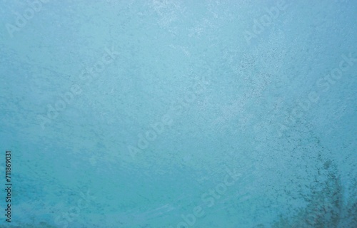 Eisbedeckte Glasscheibe mit Muster vor blauem Himmel bei Frost und Schnee am Morgen im Winter