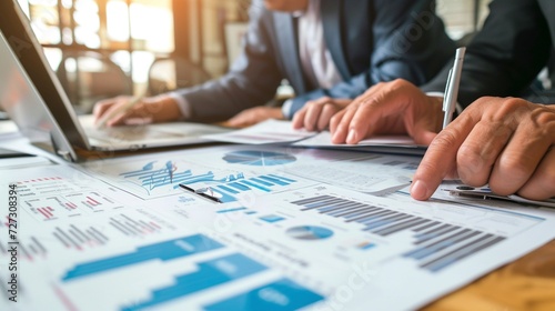 Ejecutivos analizando estadísticas de negocio y gráficos de rendimiento en documentos con un portátil en primer plano