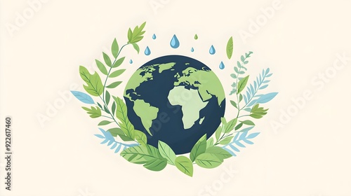 Ekologiczna ilustracja, Ziemia, Glob, Natura, Liście, Krople wody, Drzewa, Minimalizm, Miękkie zielenie, Miękkie błękity, Świadomość ekologiczna, Zrównoważony rozwój, Ochrona środowiska, Przyroda,
