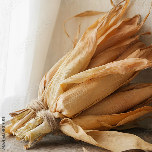 El corazón de la cosecha: Un ramo de mazorcas de maíz secas atadas con yute sobre madera rústica