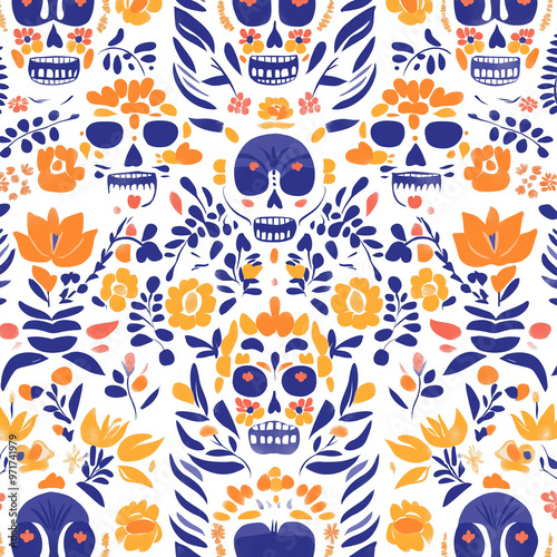 El Día de Muertos themed pattern background, skull decoration for Day of the Dead