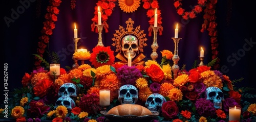 Elaborate ofrenda with marigolds, sugar skulls, candles, and pan de muerto, festive, mexico