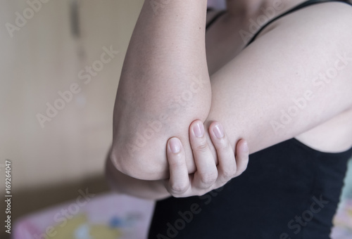 elbow pain. Women holds hand on his pain elbow, sport physical injuries when working out.
