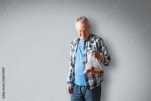 elder senior man buying some fresh fruit and put them in eco mesh bag