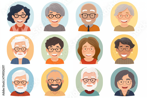 Elderly and Retired Buyer Personas People faces avatars vector collection - Set of various diverse character heads in round frames. Flat design illustrations with white background