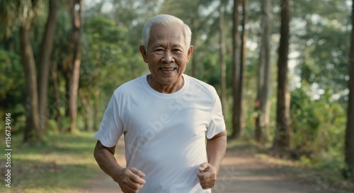 Elderly asian male jogging in park for healthy lifestyle and fitness routine