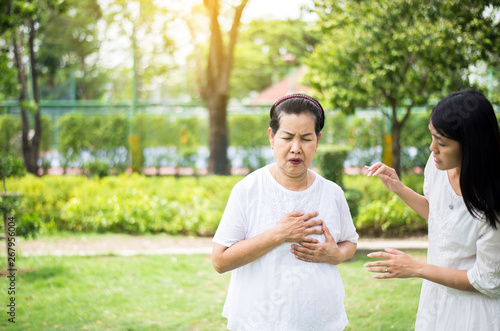 Elderly asian woman having chest pain suffering from heart attack,Daughter take care and support