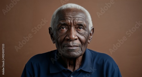 Elderly Black man with deep wrinkles neutral face soft brown background