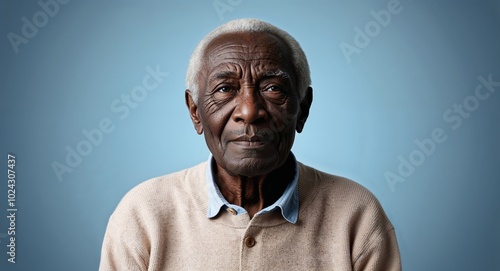 Elderly Black man with soft wrinkles neutral face light blue gradient background