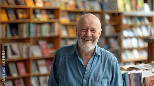 Elderly Caucasian man in a library with bookshelves in the background. Concept of senior education, learning, wisdom, knowledge acquisition. Copy space