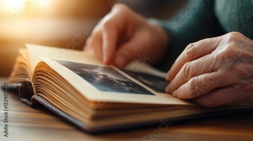 Elderly caucasian woman looking at old photo album with nostalgia and memories